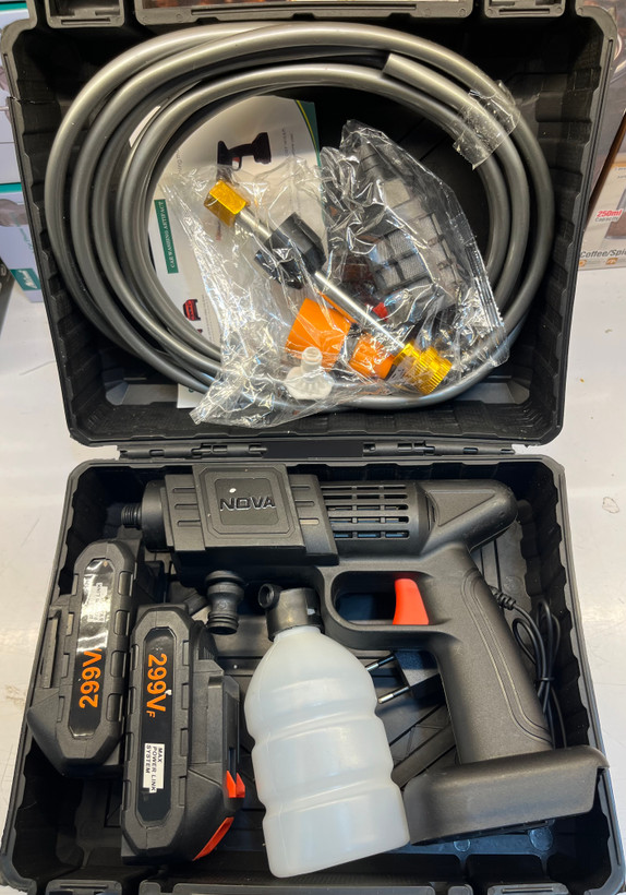 کارواش شارژی و پمپ آب شارژی و سم پاش شارژی جفت باتری برند نووا یا کارواش خانگی و پمپ آب شارژی مناسب اپارتمان و کمپینگ و منزل با دو باتری لیتیومی لوازم کامل کیف حمل برند NOVA یا nova